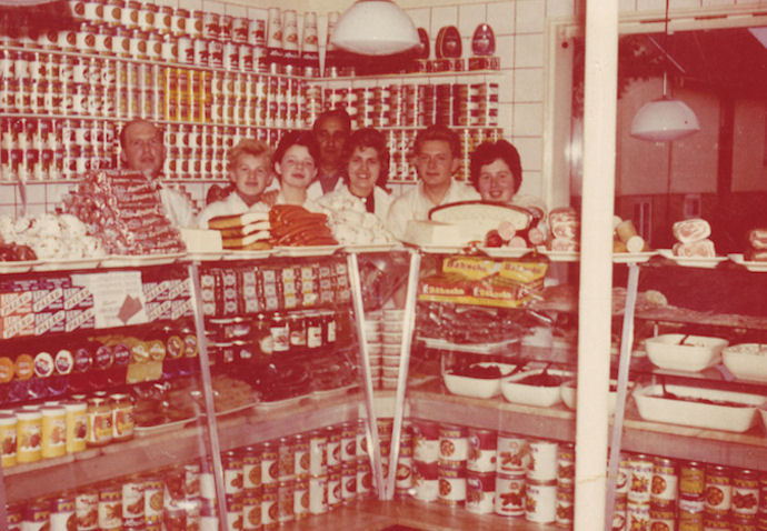 Skuldi tú keypa kjøt ella viðskera, skuldi tú upp gjøgnum einar trappur, har henda deildin var í tveimum. Øðrumegin keypti tú kjøt, fars og annað, hinumegin viðskera og ymisk salatir, sum eg síggi fyri mær. Eisini her var langt at ganga, tí tú skuldi niður gjøgnum tvær trappur, tá tú skuldi niður í slaktaríið.