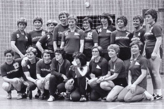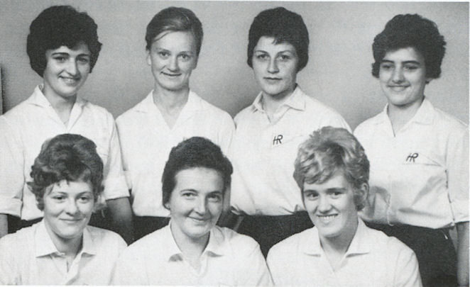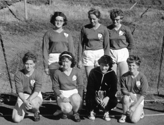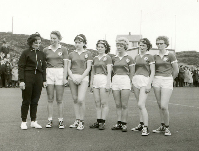 Í 1964 hátíðarheldur ÍSF 25 ára føðinginardag. Og hesar sjey kyndilskvinnur spæla ímóti Neistanum í finaluni. Frá vinstru: Elsa Poulsen, Olga Frederiksen, Sanna Waagstein Johansen, Nina Weihe, Karin Kjølbro, Hallgerð Midjord og Elin (Sissan) Mortensen. Elsa stóð altíð í málinum í svørtum venjingarbúna. (Myndeigari: Bergtóra Hanusardóttir)