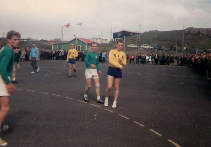 Frá vinstru Annfinn Rubek Nielsen, Joan Pætur Midjord kemur undan, Hans Holm er dómari, síðan Regin Christiansen, Sverri Jacobsen og Petur Højgaard. Leggið til merkis allar áskoðararnar. Grøna húsið er felagshúsið hjá Kyndli.