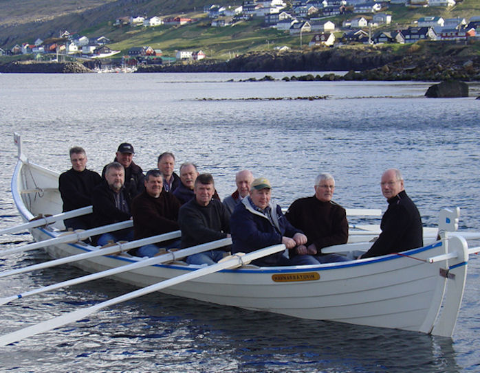 Heðin Mortensen afturi í rong umborð á Havnarbátinum saman við vinmonnum. Heðin var eitt skifti formaður í Havnar róðrarfelag: Havnarbáturin frá 1971 avmyndaður í 2014: Róðursmaðurin Heðin Mortensen, á lærinum bakborð Karl Olivar Bærentsen og stýriborð Klæmint Ludvig, síðani Jóhannis Hellisdal og Øssur Simonsen, Hans David Hansen og Børge B. Hansen, Lutherus Hansen og Høgni Egholm, Hans Petur Joensen og Hannis Joensen. (Mynd Vagnur
