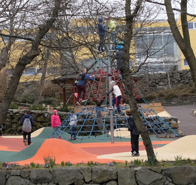 Er gott í veðrini spæla nógvur ungdómur á nýggja spæliplássinum í Grasagarði. Hetta síggi eg dagliga, tá eg koyri ella gangi framvið. Í morgun var eg fyrstu ferð inni á økinum, og har vóru nógv børn, sum stuttleikaðu sær á spæliplássinum. Grundvøllurin er gjørdur úr nakað sama tilfari, sum rennibreytin á Tórsbreyt. Eg fór inn á økið, tí eg vildi spyrja læraran hjá børnunum, um eg kundi taka mynd, meðan børnini spældu. Tað vísti seg, at tey umleið tjúgu børnini í einum triðja flokki vóru komin til Havnar úr Vági, Tey skuldu til ein fagna í Norðurlandahúsinum. Ein fyrikomandi kona úr Vági, sum eg prátaði eitt sindur við.
