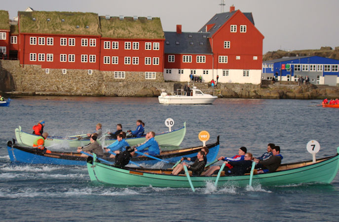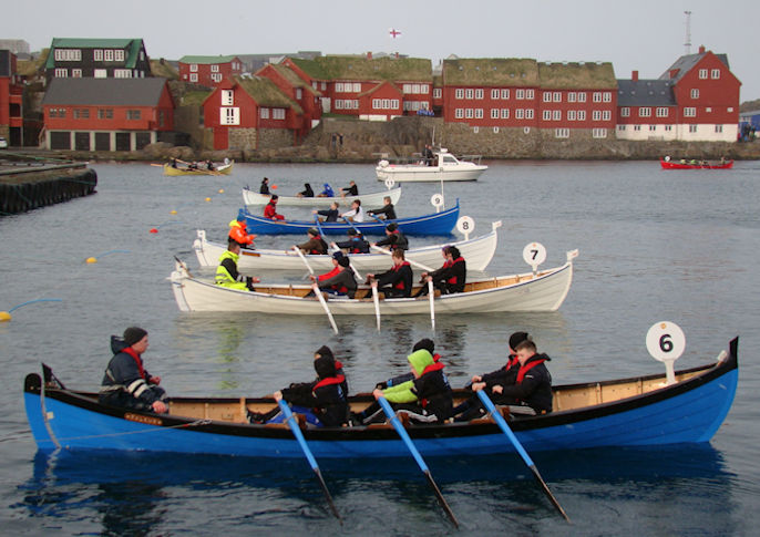 Her liggja 10-mannaførini Ormurin langi og Drekin reyði við startin. (Mynd Vagnur)