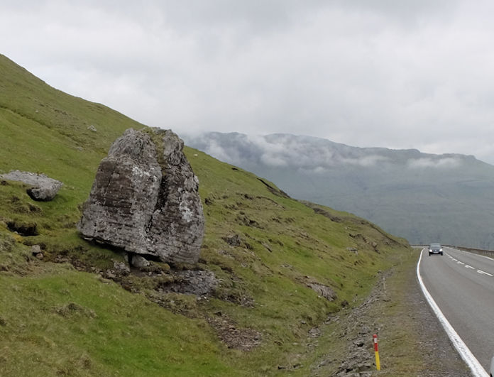 – Koyrir tú av Norðadalsskarði til Havnar og nakrar hundrað metrar suður um Skarði, stendur huldusteinurin so vakur við vegjaðaran høgrumegin. Tú sært beinanvegin á vegaføringini, at knekkur er í vegnum. Og eg minnist, at sagt var, at Landsverkfrøðingurin Mikkjal Helmsdal segði við arbeiðsformannin, at vegaføringin má broytast eitt sindur, so steinurin sleppur at standa. Teir stoyptu síðani uppundir steinin og løgd flag á, so steinurin ikki koppaði. Tú spyrt, hvussu staðið eitur, har steinurin stendur. Eg veit ikki um nakað navn júst har, steinurin stendur, men vit siga, at huldusteinurin stendur við Skarvingargil, sum er gil nakað sunnari.