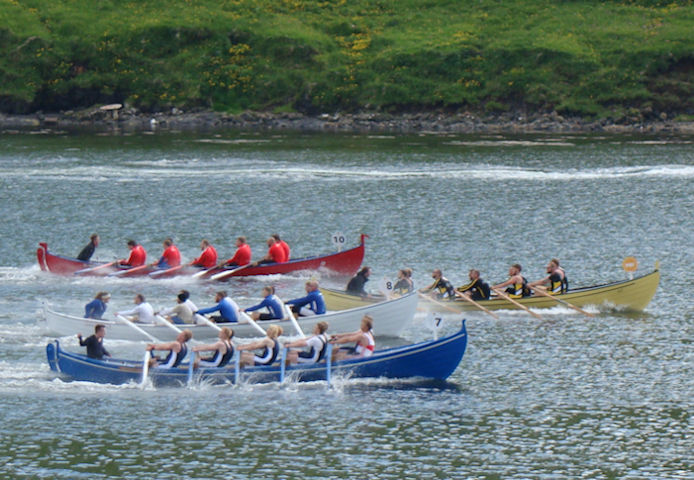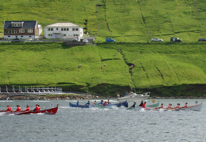 Vøkur sjón á Vágsfirði av fimm 5-mannaførum við dreingjum. (Mynd Vagnur)