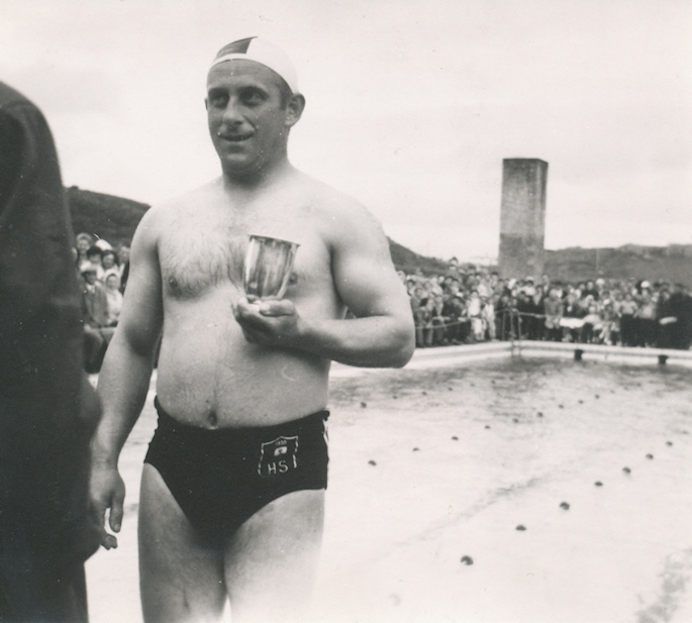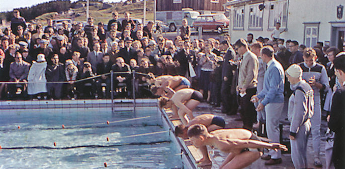 Óli Debes vinnur 400 metrar svimjikapping á ólavsøku í 1961. Svimjikapping var eitt av hæddarpunktunum á ólavsøku tá í tíðini. Heilt nógvir áskoðarar vildu síggja kappingarnar. Her síggja vit mergjaðar armar, sum veruliga vilja nakað. (Myndaeigari: Harald Debes)