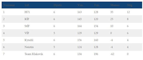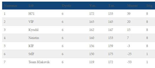 Hyggja vit í stigatalvuna hjá bestu mansliðum í hondbólti, síggja vit sjáldsama stigatalvu, sum vit ikki hava sæð áður. Liðini spæla fýra umfør í grundspælinum, og longu í fyrsta umfari hava øll liðini misti fýra ella fleiri stig. Fimm lið við átta stigum boðar frá javnari og spennandi kapping um at náa FM-finalurnar. Claus Rasmussen, sum eigur son í bestu deildini, sær heilt nógvar mansdystir, og hann havi eg biðið sett mær nøkur orð á fyrsta umfar. – Tað vera H71, VÍF og Kyndil, sum koma at manna ovastu plássini, og serliga haldi eg, at Kyndil kemur longri upp á tindin, men so má mangan skaddi Hørður stýra verjuspælinum, sigur Claus og heldur fram. Ovara stigatalvan er talvan nú, og niðara talvan somu tíð í fjør. .