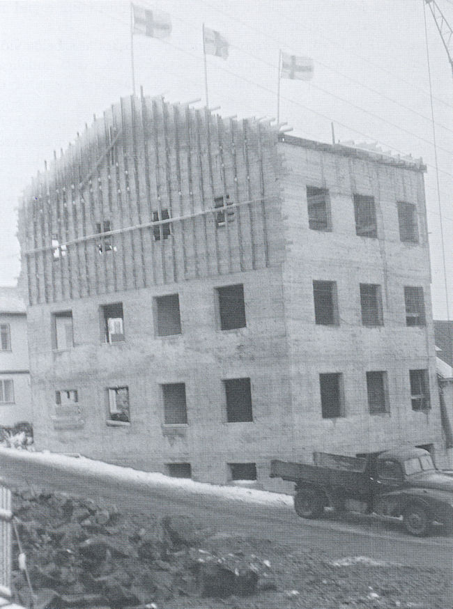 Hesin ljóti betongkassin skuldi ongantíð verið bygdur í 1960-árunum. Heldur skuldi annar vakur bygningur verið bygdur afturat Losjubygninginum. (Mynd: Bókin støt viljen 100 ár)