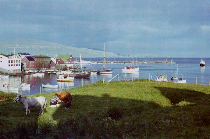 Havi mangan hugsað, hvat stóri hjallurin úti í Bakka var brúktur til, tí sum ungur minnist eg ikki nakað virksemi har. Nú síggi eg í bókini Havnin – fólk og yrki, at húsið æt “Tórshavnar Netbarkarí”. Og hvat er so tað? Í 1955 stovnaði Kaysten Andreasen, sum var beiggi Torvald Andreasen skipara, “Tórshavnar Netbarkarí”. Sildagørn vóru barkaði og bøtt, eisini vóru gørn og annar reiðskapur goymdur í stóra hjallinum. Orðið at barka kenna vit frá at barka húðir og skinn. Sildagørnini vóru smurd við serligum innfluttum evni, sum líktist tjøru, og hongd at turka í hjallinum. Eg minnist, at tað luktaði av tjøru í húsinum, sjálvt um virksemið var steðgað. Kaysten gavst við barkarínum fyrru helvt í 1960-árunum. Ikki so nógv ár síðani, at húsið var niðurtikið. Ja, so síggja tvær kýr á Skálatrøð, og mann sita á krakki og mjólka brúnu kúnni. Kúgv er ikki longur at síggja innan fyri eingjargarðarnar í Havn. Nógv skip fyri teym, og Molin er ikki longdur út í núverandi longd. Myndin er frá 1960-árunum. Haldi, at myndin er áhugaverd. (Vagnur)