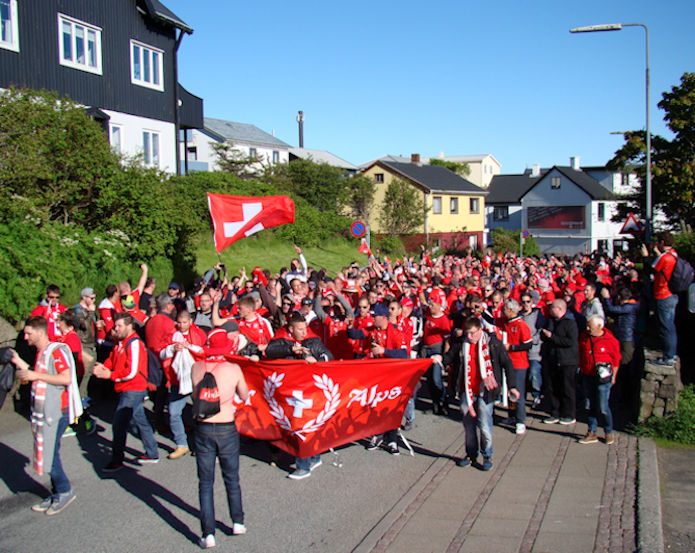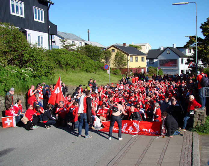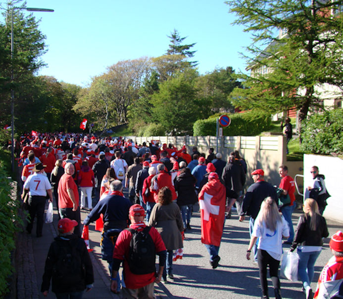 Nú búgva vit soleiðis fyri við Hoydalsvegin, at tá fólk skulu úr miðbýnum niðan Gundadal, ganga tey fram við hjá okkum. Knappliga fríggjakvøldið hoyrdist øgilig róp niðri við Sjónleikarahúsið, og løtu seinni kom stór gonga við sveisarum í reyðum framvið KFUM. Skjótur var eg oman á vegin við myndatólinum. Og knappliga hendi nakað, sum var áhugavert og spennandi. Stóra mannfjøldin steðgaði knappliga, og øll niður á húka, og so hoyrdist nøkur øgilig kampróp, sum eg ongantíð havi hoyrt áður so ógvusliga, uttan iva, tí eg stóð so nær. Lítla løtu seinni hildu tey leiðina niðaneftir. Komi at hugsa um 1970 og 1980 árini, tá áskoðarar í hundraðtali úr Klaksvík og Tvøroyri komu framvið hjá okkum. Tey vóru komin til Havnar við Teistanum ella Smyrli til tess at stuðla sínum liði, sum spældi ímóti HB ella B36 í Gundadali. Har vóru stór fløgg og áskoðarar klæddir í blátt ella svart/hvítt. Henda vælkenda TB-sirenan var eisini við í stóra fylginum. Ja, so tók eg eisini myndir av stóru LGBT skrúðgongunum, sum gingu fram við hjá okkum úr Gundadali oman í miðbýin. Nú er LGBT málið tíbetur endaliga avgreitt, og so er spurningurin, vit eisini seinast í juli mánað síggja LGBT skrúðgongu uttan fyri hjá okkum. (Vagnur)