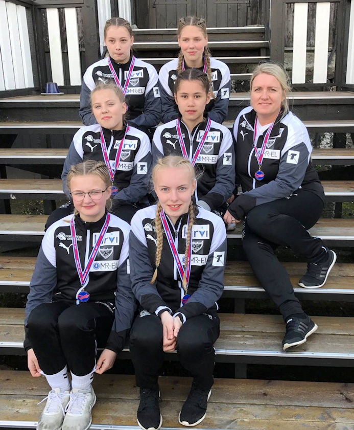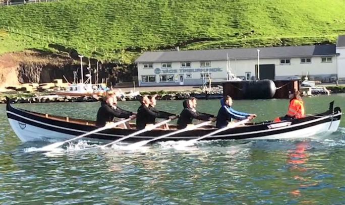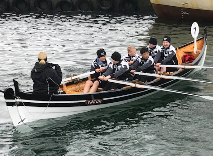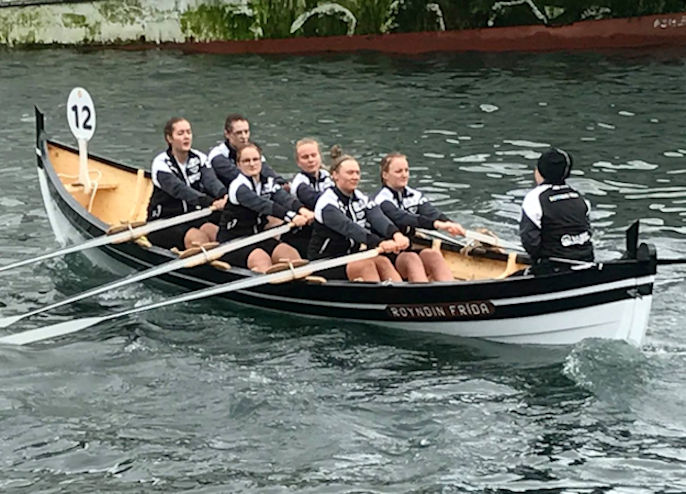 Svalan 5-mannfar gentur barnróður. Aftast f.v: Rakul Bech Jacobsen og Britt Vøldice, í miðjuni f.v: Bára á Lágabø, Katrina Jatchona og Sigrid Kærbech. Fremst f.v: Tórgerð Suðuroy og Silja Kærbech. (Mynd Rógvi Kærbech)