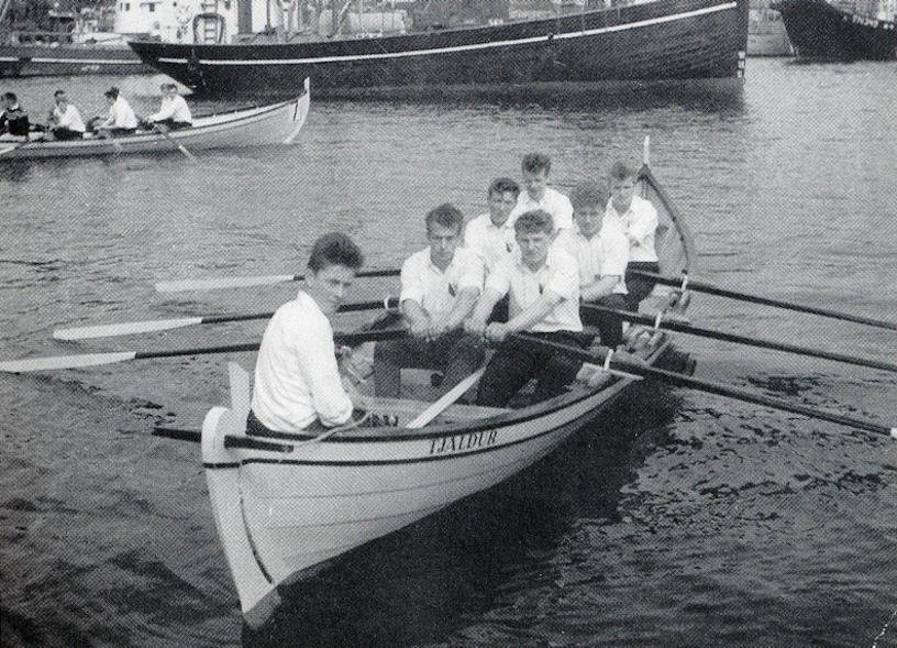 Tjaldur av myndað í 1963, tá báturin vann allar róðrarnar. Tá æt gula 5-mannafarið Tjaldur, nú eitur báturin Tjaldrið: Myndina fann í bókini ÍSF 50 ár. Kenni væl andlitini, men ikki nøvnini á frálíku rógvarunum.