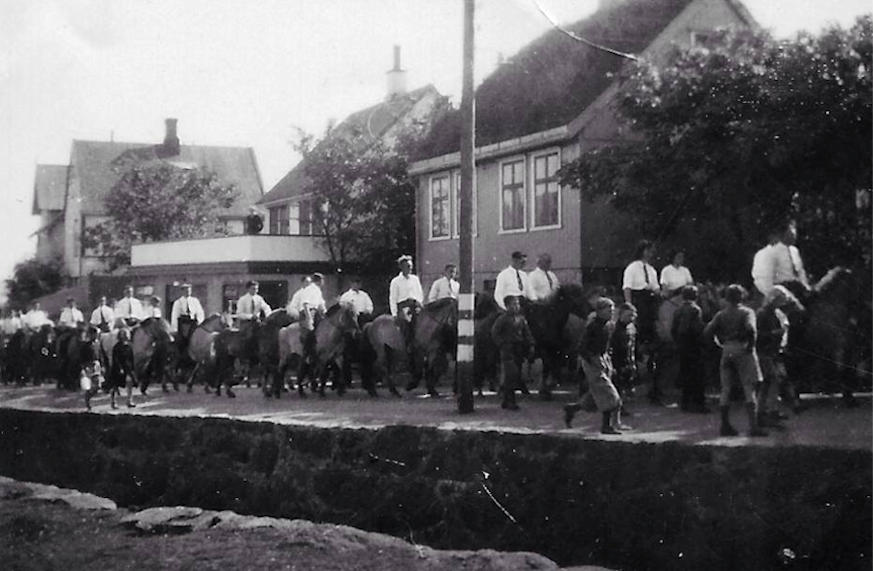 Áhugaverd mynd, má sigast, men so er spurningurin, nær myndin er tikin. Haldi meg síggja Tummas Rubeksen, sála, á myndini, sum uttan iva er tikin ólavsøkuaftan, eftir at reiðfólkini hava verið til ólavsøkuskrúðgongu. Sigi hetta, tí vanligt var á mínum ungdómsárum, at kappríðing var ólavsøkudag úti á Velbastaðvegnum í Havnardali, og tá savnaðust reiðfólkini fyrst á Vaglinum fyri síðani at halda leiðina út í Havnardal. Tey riðu kapp á Velbaðstaðvegnum frá 1926 til 1972, tá farið var niðan í Marknagil. Fyri 1926 riðu tey kapp á Sundsvegnum.