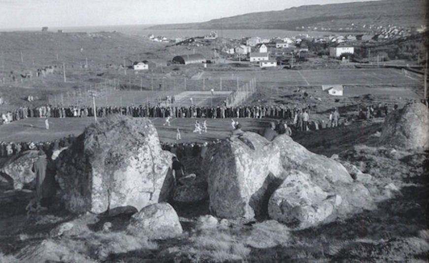 – Húsini hjá okkum, sum tú sært á myndini, eru bygd í 1934. Sum smádrongur sóu vit frá okkum oman á fótbóltsvøllin, tí trøini vóru tá ikki vorðin so stór, at tey fjaldi vøllin. Minnist serliga krígsárini, um tað mundið myndin er tikin. Skotskir hermenn vandu fótbólt á vøllinum. Teir spældu dystir ímóti hvør øðrum og eisini ímóti føroyingum. Vit sóu allar hesar dystir og vóru mangan á vøllinum.