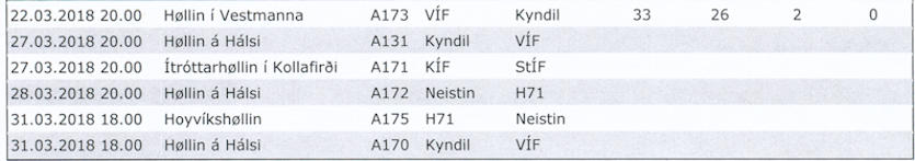 Annars er støðan í besti mansdeild, at taptir Neistin ella H71 allar restandi dystirnar, og VÍF vinnur allar dystirnar, so kemur VÍF í hvørfall í FM-finalurnar. Støðan í løtuni er, at Neistin og H71 hava 31 stig, meðan VÍF kann náa 32 stig. Kyndil hevur mist møguleikan. Neistin skal spæla tveir dystir ímóti H71, ein ímóti Kyndli og ein ímót VÍF.