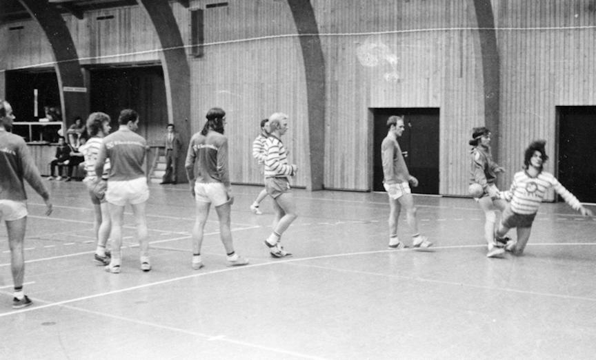 Vit eru til dyst í høllini á Nabb, sum vit tá róptu nýggju høllina. Dysturin er millum mansliðini hjá Kyndli og Neistanum, og sjálvur spældi eg við Neistanum. Við sorgblídni eisini at síggja myndirnar, tí fleiri spælarar eru ikki millum okkum longur. Herfyri fór um sýn málverjin hjá Kyndli Hjørleif Kürberg, sum sæst á eini myndini.