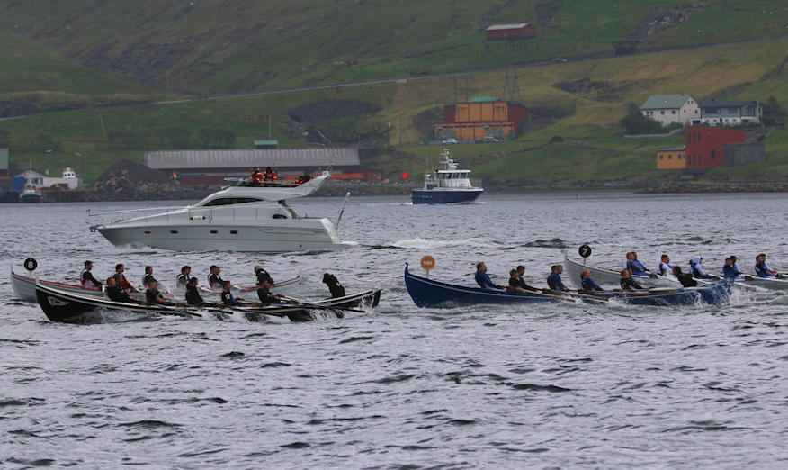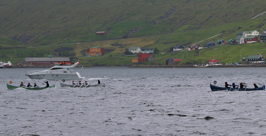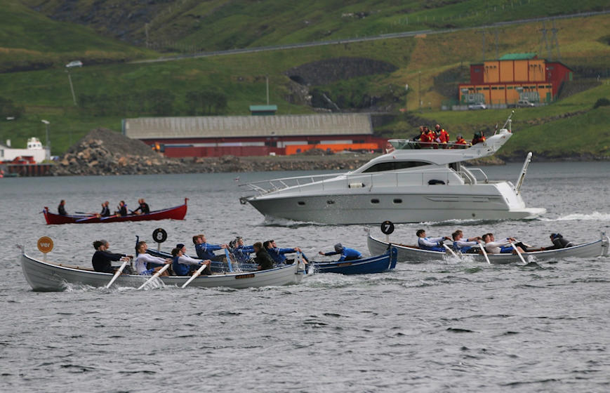 Eisini vøkur sjón at síggja teir tólv gentubátarnar liggja á málinum í Vestmanna. Bátarnir sóust ikki so væl, tí nú var sólin farin á skýna, sjálvt um mjørkin fjaldi ovara partin av Vágoynni. Frálíkar myndir og spenandi at bíða eftir startskotinum, har tú hoyrir startdómaran rópa á bátarnar. Suni Merkistein segði frá róðrinum, og Hannis Joensen var viðmerkjari. Hetta var alt frálíkt.