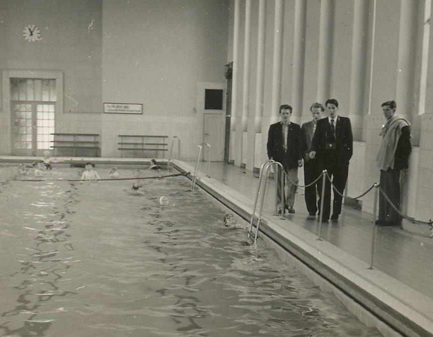 Petur á Sandi, Eivind Dam og Hans Marius Mikkelsen vitja innandura svimjihyl. Tá var eingin slíkur í Føroyum.