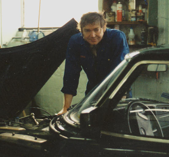 Freddy arbeiddi í tvey ár sum bilsmiður í Liverpool. Her á verkstaðnum hjá Saab Yviri við Strond. (Myndaeigari John Vilhelm)
