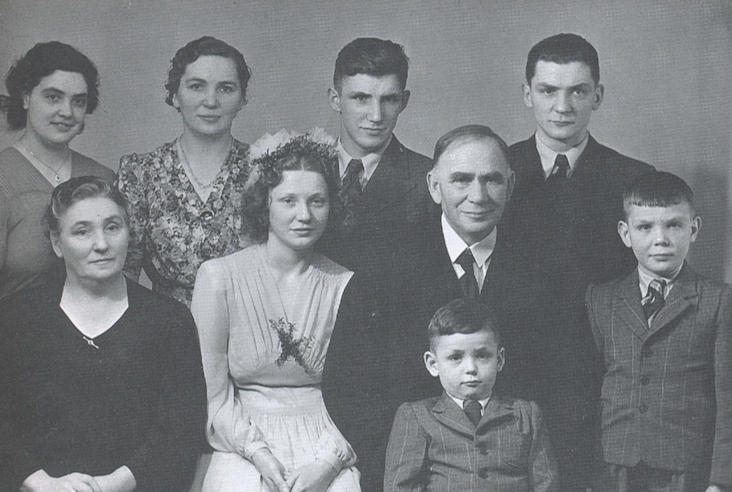 Niels, Elsba og børnini. Standandi f.v: Sanna, Ella, Petur og Dánjál. Fremst f.v: Elspa, Hanna, Niels, Helgi og Lorenz i fanginum á pápanum. (Mynd. Úr bókini um Sámal á Krákusteini).