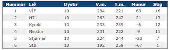 – Stigatalvan er góð mynd av gongdini, nú tíggju dystir eru spældir í grundspælinum. VÍF liðið er mannað við nógvum royndum eldri spælarum, og er gott lið. Á H71 liðnum eru nógvir frálíkir javngamlir spælarar, og tá Marita kom aftur úr Danmark, styrknaði liðið munandi.