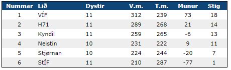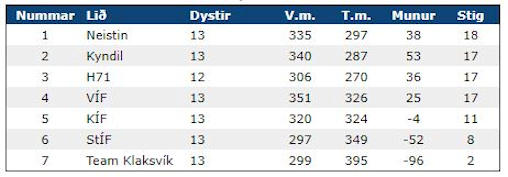 Hyggja vit í stigatalvuna hjá kvinnum, so var serliga áhugaverdur dystur spældur hóskvøldið millum H71 og Kyndil, sum endaði við javnleiki 26-26. Vann Kyndil dystin, sum eg roknaði við, so fekk Kyndil H71 aftur í stigum eftir slaka byrjan í kappingini.