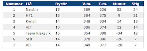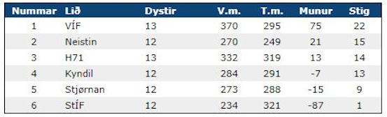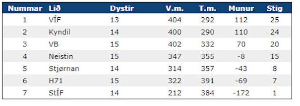 Til stuttleika leggi eg eisini stigatalvur aftrat tekstinum, sum eru frá januar mánað seinasta kappingarár. Beinleiðis syrgiligt at síggja kvinnuliðið hjá VB á stigatalvuni. Kvinnukappingini mist heilt nógv nú VB ikki fekk mannað lið. (Vagnur)