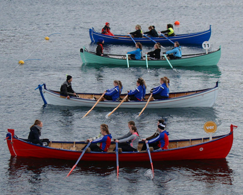Vónandi eydnast at manna Koll við gentum, sum vit síggjast næstuttasta bát. Gentubátarnir rógva ódnartøk í Vestmanna í 2018. Nærmast Drekin, síðani Blikur, Tambar, Falkur, Kollur og Knúkur. (Mynd Hvannrók)