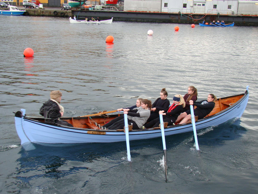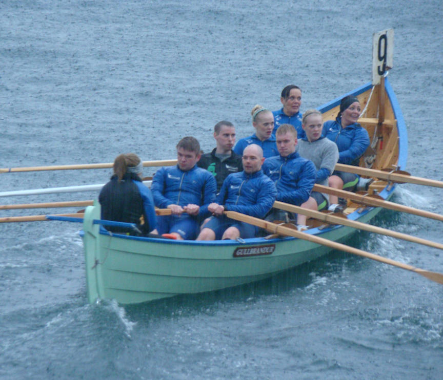 Í oysandi regni Í Havn rógva tey til stuttleika ódnartøk í Gullbrandi. Betina á toftubekki bakborð róði í fleir ár við 6-mannafarinum Rádna. Stuttlig mynd. (Mynd Vagnur)