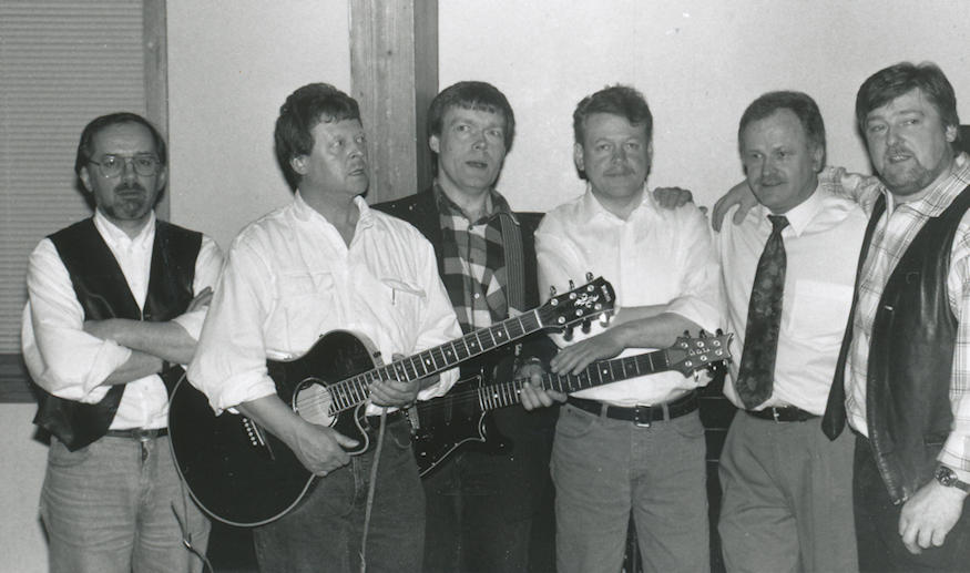 Rúnar á pallí í Ítróttahøllini á Hálsi í 1996. Frá vinstru Jógvan Sofus Vágsheyg, Finnbogi Johannessen, Ólavur Øster, Jens av Reyni, Regin Jacobsen og Erling Berg. (Mynd Vagnur)