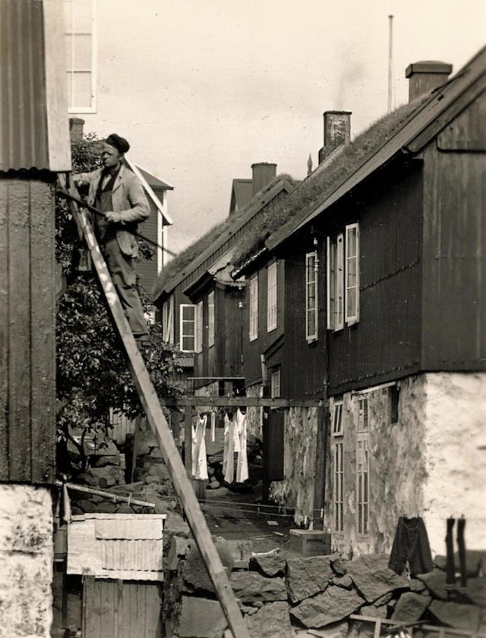 Tummas Juel tjørar húsini. Hann doyði ungur bara 51 ára gamal. Áhugavert at síggja hesi tjøraðu húsini við flagtekju. (Myndaeigari: Marni Mortensen)