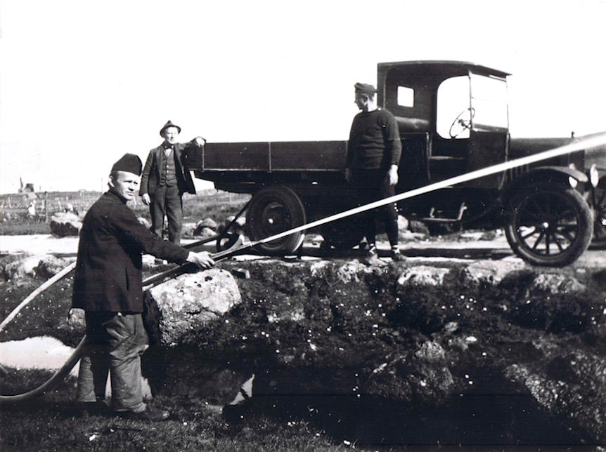 Tummas Juel Mortensen uttast til vinstru og síðani Nyholm Debess og Júst Sivertsen. Fyrsti bilurin í Føroyum ein hálvt tons Ford lastbilur. (Mynd Fornminnissavnið)
