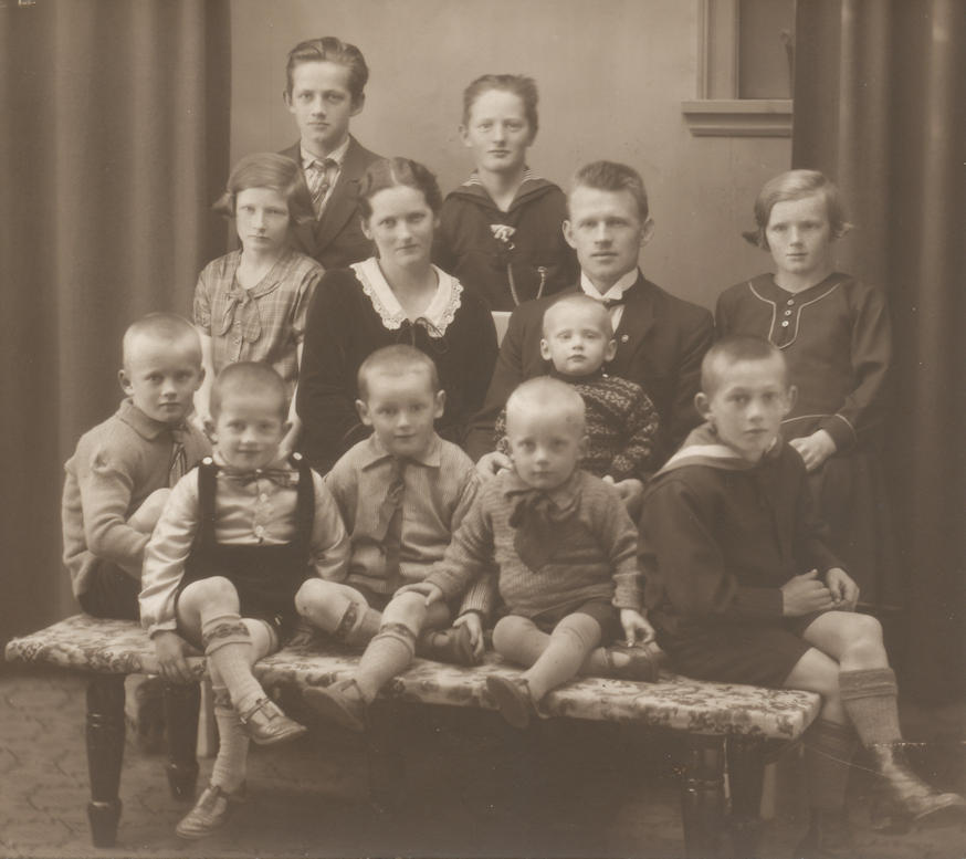 Tey tólv børnini hjá Tummas Juel og Helenu Mortensen: Aftast f.v: Ebbe, Mourits og Anna Louisa. Miðrað f.v: Arni, Helgi, Jona, Marsanna og John. Fremst f.v: Finn, Hákun, Venna og Óli. (Myndeigari: Helena Mortensen)