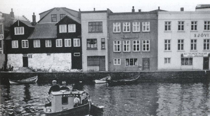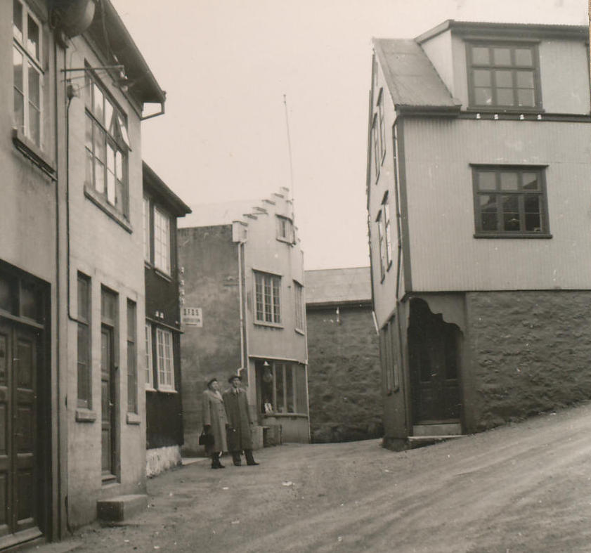 Mynd frá 1950, tá Harry S. Johansen og svenskur gestur spáka í Gongini. Vit síggja húsini hjá Ebbe og Henny, húsini hjá Frú Müller, Wellejus, pakkhúsið hjá Evensen og til høgru Kristnastova. (Mynd ur myndabók hjá Harry s. Johansen)
