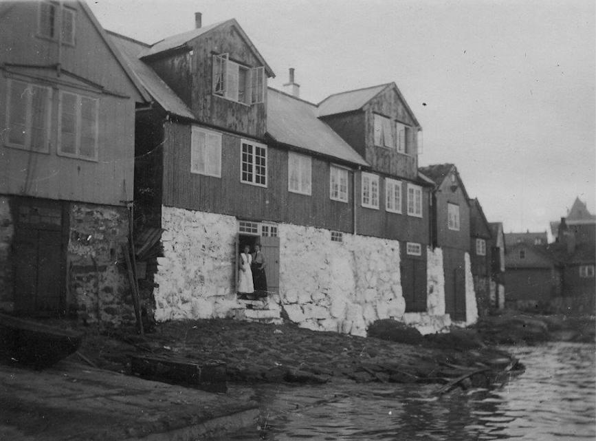 Siti júst og hyggi at 70 ára gamlari mynd, sum eg fekk úr myndabók hjá Harry S. Johansen. Tankar mínir leita aftur í barnaárini, og vit eru stødd við húsini hjá Frú Müller í Gongini og síggja eisini radiohandilin hjá Wellejus. pakkhúsið hjá Evensen og Kristnastovu. Síggi fyri mær, tá eg saman við ungdómsvininum Jan Müller nakrar ferðir var inni hjá Frú Müller, sum var omma Jan.
