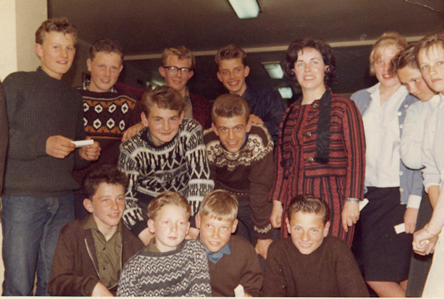 Neistaungdómar í Noregi í 1964. Frá vinstru aftast: Finn Bjørn Guttesen, Jógvan Martin Mørk, Niels Símun Johannessen, Tønnis Wardum, Elinborg Trond Johansen, ferðaleiðari, Sólrun Mikkelsen, ferðaleiðari, og Mai Breckmann og Helena Mortensen, sum vóru í gentuhópinum. Húkandi í miðjuni frá vinstru: Bjarni Samuelsen og Sverri Wang. Fremst frá vinstru: Tummas Joensen, Echardt Persson, Eyðfinn Lamhauge og Kristjan á Neystabø.