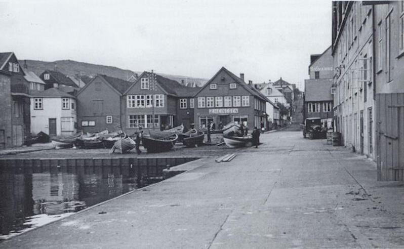 Standmyndin av Nólsoyar Pálli var ett í Vágsbotni, tí hon hevur søguligt tilknýti til húsini millum anna Einahandilin. (Mynd: Havnin – fólk og yrk)