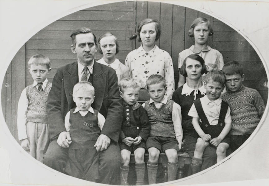 Skómakarin Knud og konan Jetta Alvilda og níggju av teimum trettan børnunum. Myndin er frá umleið 1930. (Myndaeigari: Knútur Gray)