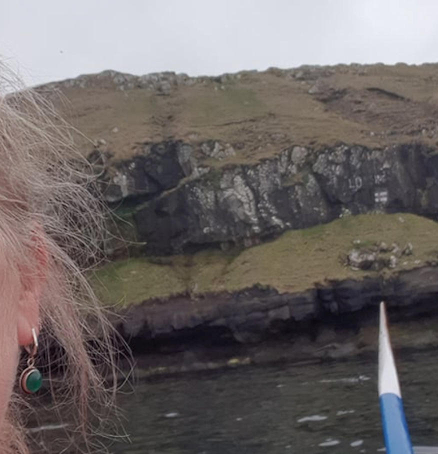 Onnur mynd tikin úr bláum kappróðrarbáti av LOYSING. Her hevur onkur málað merki. LOYSING er litfarið av tíðarinnar tonn.