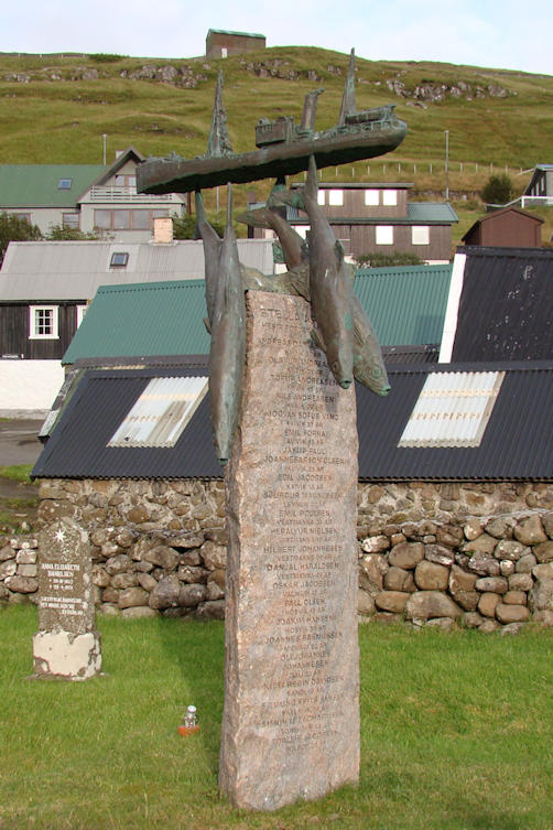 Vakur minnisvarði í Kvívík. Nøvini á teimum 22 monnunum eru høgd í minnisvarðan, og fýra ljós eru eisini at síggja á hógvinum, so hugaligt kundið verið at sæð hann, tá myrk var. (Mynd Vagnur)