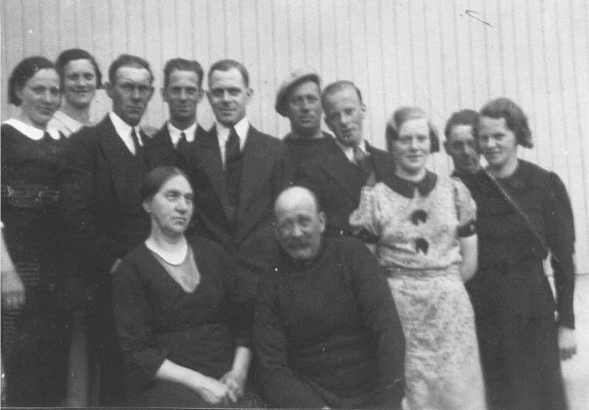 Mina og Niels Persson og børnini. Børnini frá vinstru: Esther, Amanda, Sigfred, Frants, Peter Mohr, Niels, Gustav, Hilda, Børge og Elisabeth.