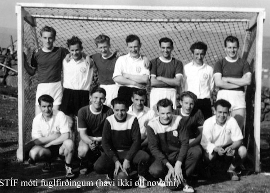 StÍF og ÌF í 1958. Fuglfirðingarnir í reyðum st.v: Petur Jacob Eliasen, Petur Sigurd Rasmussen, Eilif Samuelsen og Poul Leiti. Húkandi f.v: Jógvan Òlason, Thorleif Samuelsen og Birgir Hansen. StÍF í hvítum st.f.v: Odmar Klein Olsen, Sandur Davidsen, Elisar Høj. Húkandi f.v: Petur Magnusson, Poul Johannus Johansen og Hildibjartur Johansen.