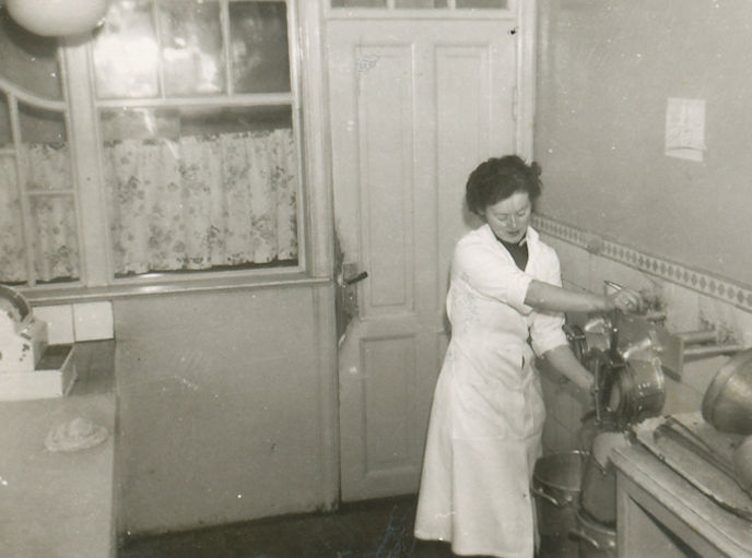 Handtakið aftur og fram á mjólkarpumpuni, so var ein pottur í spannuni. Kvinnan eitur Maria Steinkross. (Myndaeigari: Einar Michlensen)