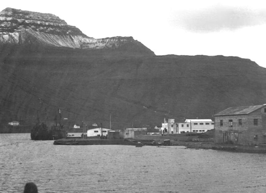 Kollafjørður í 1950-árunum. Sethúsini uttast til vinstru er tey hjá Guttormi Poulsen. Stóri hvíti bygningurin er fiska-og turkihúsið hjá Jógvani og Guttormi. (Christian Holm Jacobsen myndasavn)