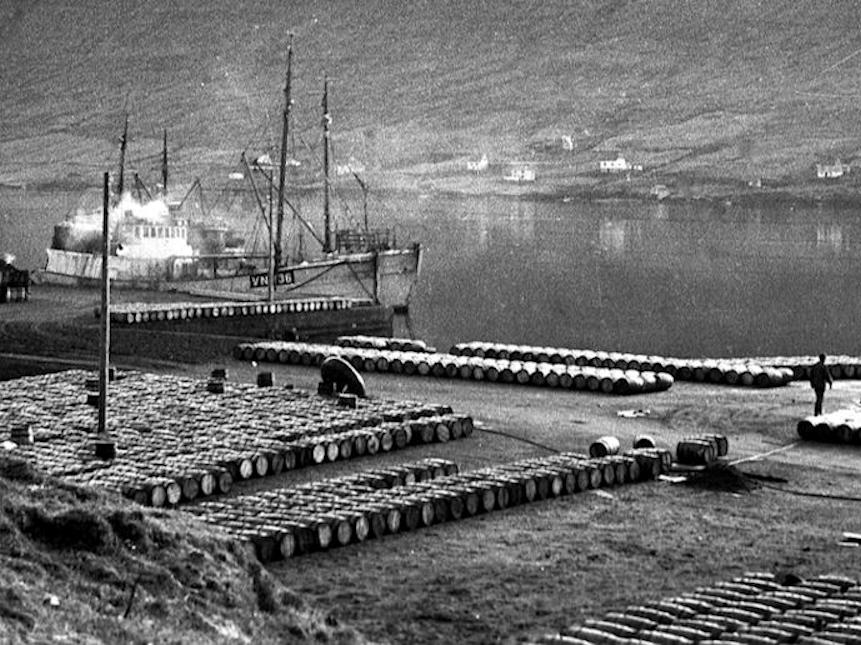 Soleiðis minnist eg sum smádrongur nógvu sildatunnurnar á Langasandi. Skipini Vestfart og Keflavík við bryggju á Langasandi. (Christian Holm Jacobsen myndasavn)
