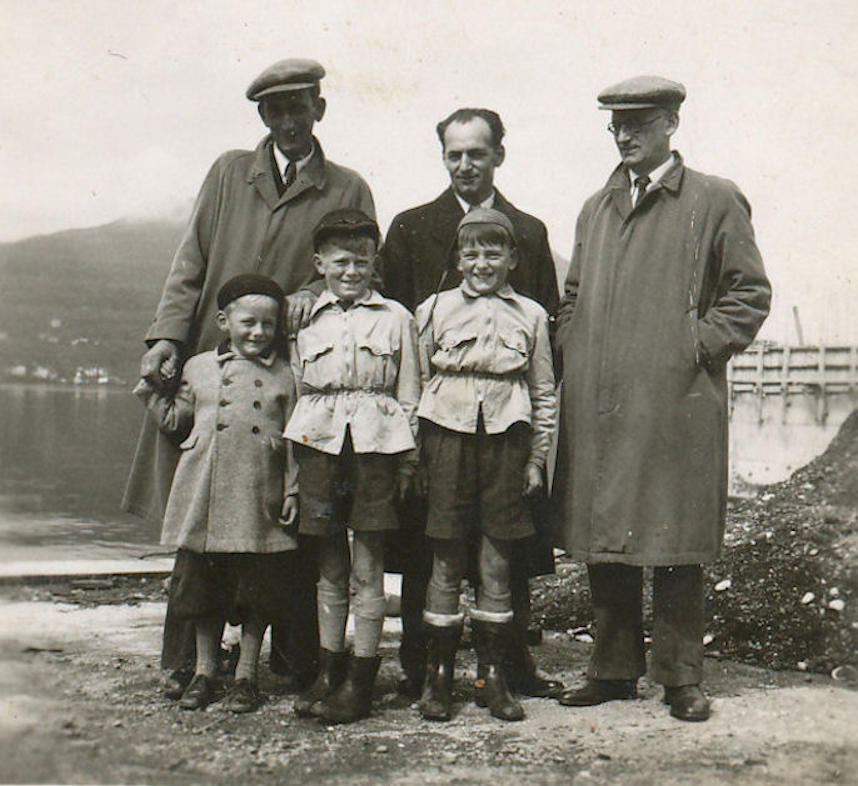 Jógvan gekk altíð í keppi ella hatti. Standandi f.v. Svágurin Helge Michelsen, beiggin Edgar Christiansen, sum ungur fór til Danmarkar, og síðani Jógvan. Dreingirnir eru fr.v: Hans Jákup sonur Helga og Vilhjálmur og Christian synir Debes beiggja Jógvan. (Myndaeigari Margit)