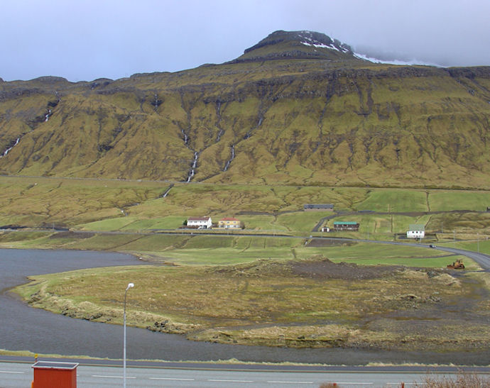 Uttast til vinstru gomlu myndini síggja vit húsini hjá Guttormi og Ragnhild Poulsen, húsini, sum nú eru farin at aðrar hendur. Guttorm var systkinabarn mammu mína, so eg kom mangan sum ungur í hesi hús. Ragnhild býr á Ellisheiminum í Havn. Vit síggja eisini gamla skúlan, sum eru húsini við høgu reisingini. Longri til høgru síggjast húsini hjá Claudiu Thomsen, og síðani bóndagarðin á Oyrareingjum. (Vagnur)