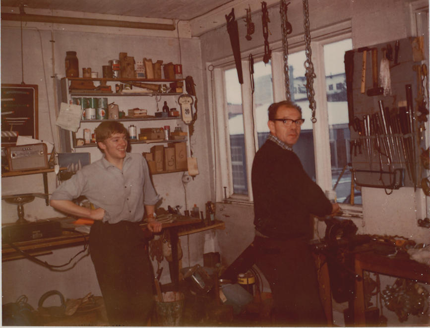 Høgni og Leivur til arbeiðis á seglvirkinum. Báðir er útbúnir seglmakarar og fingið sveinabræv í Danmark.