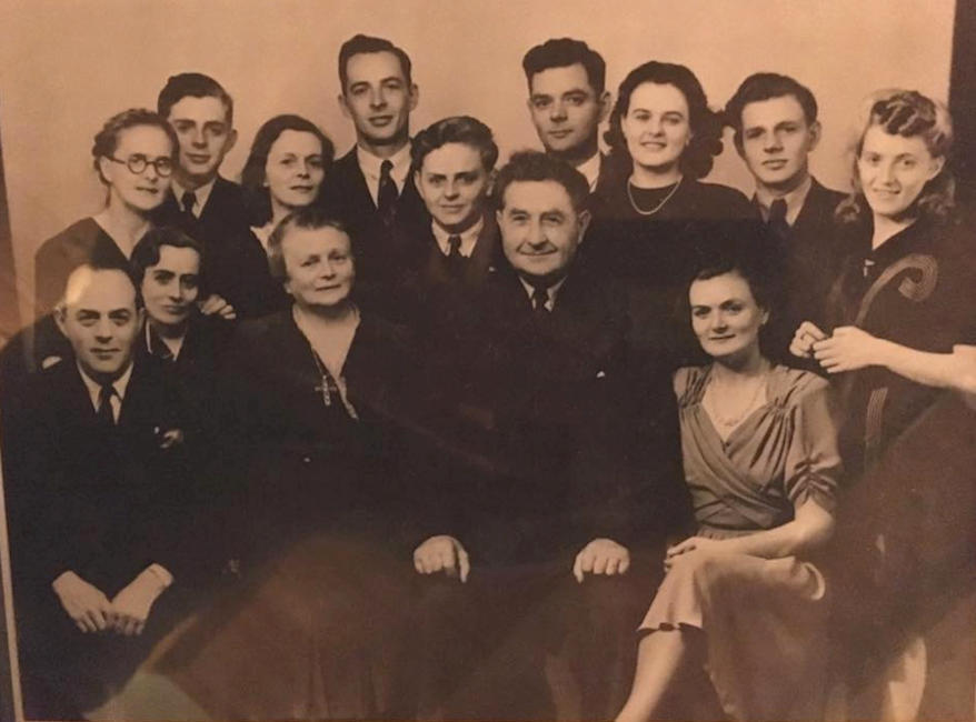 Niels í Heiðunum (1885 – 1974) og Mia (1887 – 1970) áttu tólv børn, og her eru øll á myndini saman við foreldrunum. Aftast frá vinstru: Bergit, Ásmundur, Nina, Petur, Eirikur, Hans Andreas, Hildur, Leivur og Mimmi. Fremst frá vinstru Niels Jákup, Elly, Mia, Niels og Brynhild.