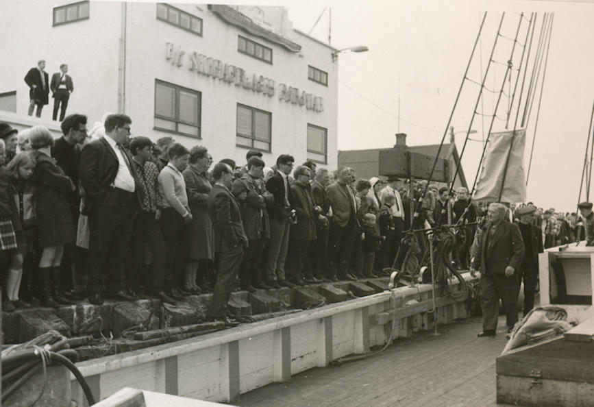 Stór mannamúgva var á bryggjuni at siga farvæl, tá deyðsiglarin skuldi til Danmarkar. Vit síggja Niels í Heiðinum og Debes Christiansen á dekkinum.