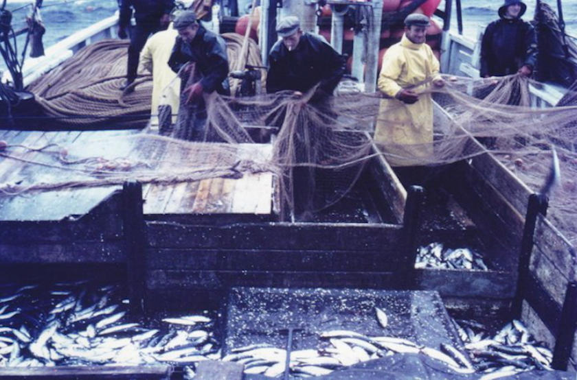 Her draga teir gørnini og rista sildirnar úr gørnunum. Síðani vantar nógv arbeiði, áðrenn sildirnar eru komnar í tunnurnar og í lastina. Mynd frá 1965 umborð á Saint Jacques TG 56 úr Vági.